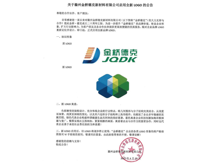 新LOGO啟用后,舊LOGO將逐步停止使用,“金橋德克”企業(yè)的各類LOGO形象均將嚴(yán)格按照我司VI手冊(cè)規(guī)范使用,敬請(qǐng)關(guān)注留意。由此給您帶來(lái)的不便,敬請(qǐng)諒解!